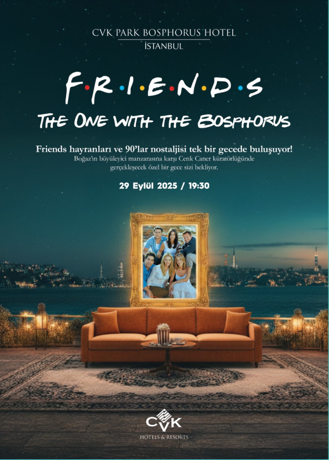 CVK Park Bosphorus Hotel, dünya çapında milyonlarca hayranı bulunan kült dizi Friends için eşsiz bir etkinliğe ev sahipliği yapıyor. 29 Eylül Pazartesi akşamı saat 19:30’da, boğazın göz alıcı manzarasına karşı konumlanan ikonik Bosphorus Terrace’ta gerçekleşecek The One with the Bosphorus gecesi, misafirlerine hem nostaljik hem de eğlenceli bir deneyim vadediyor.