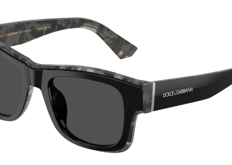 Kare formu ve ikonik estetiğiyle tanımlanan bu model, birbirini tamamlayan iki renkte çift katmanlı asetat yapıya sahip. Saplarda Dolce&Gabbana logosu bulunurken, menteşe iç kısımları ve sap uçları lazerle işlenmiş zikzak motifleriyle süslenmiştir. Koyu tonlu iki katmanlı asetat seçenekleri, uyumlu lensler ile tamamlanarak zarif bir görünüm sunar.
