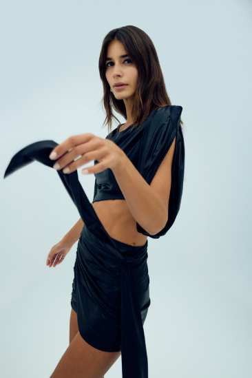 etkileyici stilinden ilham alarak tasarlandı. Parlak likralı kumaşı, büzgülü ve drapeli kol şal