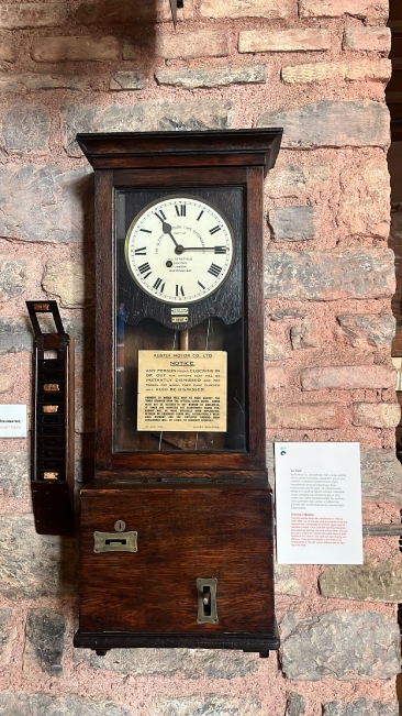 1925 yılında üretilen ve Austin Motor fabrikasında kullanılan İşçi Saati de müzenin bir diğer ilgi çekici parçası. Bu zaman kayıt cihazı, çalışanların giriş ve çıkış saatlerini kaydederek ücretlerin doğru olarak hesaplanması amacıyla kullanılmıştı. Çalışanlar haftalık kartlarını her sabah ve öğleden sonra makinedeki yuvaya yerleştirip kolu çekerek giriş ve çıkış saatlerini yazdırıyordu.