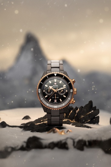 Captain Cook High-Tech Ceramic Chronograph, dağın kalbinde, karanlığı aydınlatan, altından bir mağaranın içinde bulunuyor. Yıldızların dövüldüğü bir pota gibi elemental bir havaya sahip olan bu pota, çağdaş stili yansıtan bu güzel saat için uygun bir zemin oluşturuyor. İki tonlu siyah ileri teknoloji seramik, mat kasaya kontrast oluşturan parlak bileşenler ve pembe altın renkli süslemelere sahip zengin estetiği, onu sadece bir spor saatinin ötesine taşıyarak kutlama sezonu için mükemmel bir aksesuara dönüştürüyor. Gücünü Rado kalibre R801 otomatik mekanizmadan alan ve 59 saatlik güç rezervine sahip kronografı, yüksek irtifalardaki maceralar için kusursuz olan şaşırtıcı doğruluğu sağlarken, 30 bar’a (300 m) kadar su geçirmezliği en büyük derinliklerde pratik kullanım sunuyor.